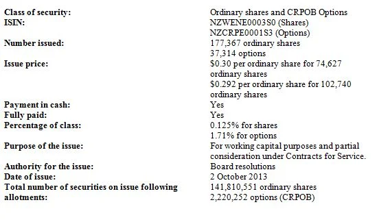 In addition two contractors of the Company (CRP-OCS Consulting Limited and Robin Falconer Associates Ltd) have each received 51,370 shares under Contracts for Service at $0.292 per share. These shares represent partial payment for services. Pursuant to those contracts for service the issue price of NZ$0.292 per share reflects the 20 day volume weighted average price of a share on the NZAX market to 30 September 2013.